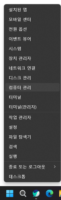왼쪽 아래 윈도우키에서 마우스 우클릭 후 컴퓨터 관리 선택