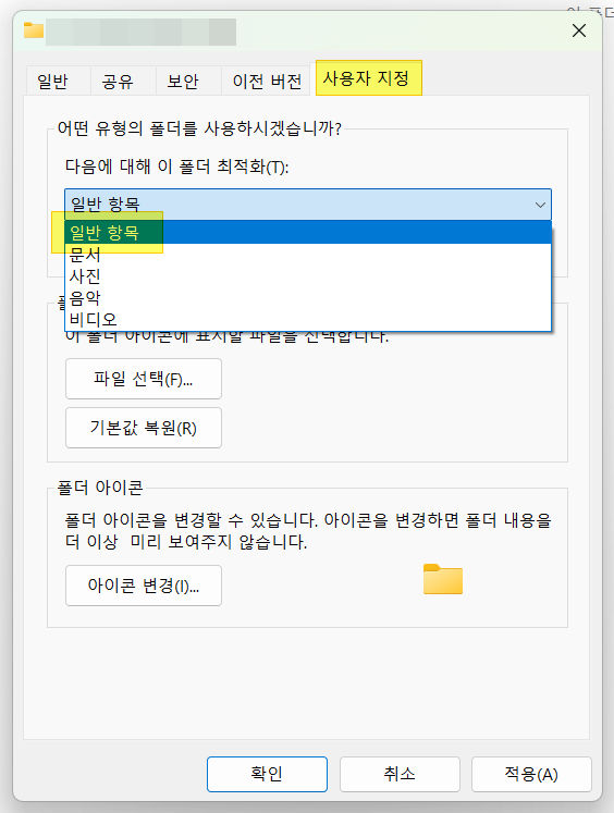 3. "다음에 대해 이 폴더 최적화" 아래에 있는 드롭다운(콤보박스) 목록을 클릭하고 "일반항목"을 선택하면 가장 통상적인 보기 유형이 되고, 아니면 원하는 다른 유형을 선택