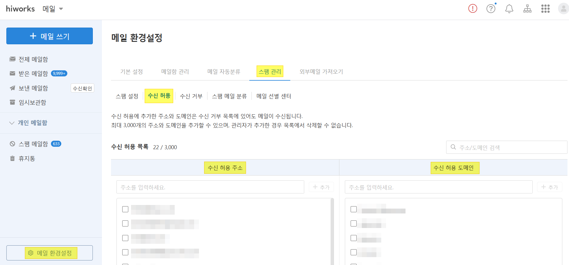 2. 수신 허용 주소에 "def@abc.com"과 같이 특정 메일주소를 입력